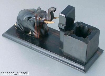 A superb vintage African hardwood kneeling elephant, matchbox holder and ashtray on a plinth. Unusually, in perfect undamaged condition with intact eyes, tusks and nails. Bronze cigarette rests to the ashtray. Measures about 7 3/4 x 3 x 4 inches (19.5 x 7.5 x 10cms) and weighs 430g.