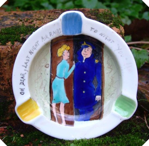 A hand painted c1940s risque ashtray. The inscription reads "Oh dear, last night air raids, tonight you!!". About 10cms 3 7/8 inches in diameter and weighs 60g. This is one of a collection that we currently have in stock and are listing. Please contact us should you be interested in more than one and we will offer a reduced combined price.