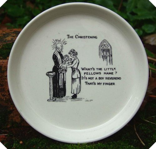 A hand painted c1940s risque ashtray. The inscription reads "The Christening. What's the little fellows name? It's not a boy Reverend that's my finger". About 11.7cms 4 5/8 inches in diameter and weighs 115g. This is one of a collection that we currently have in stock and are listing. Please contact us should you be interested in more than one and we will offer a reduced combined price.