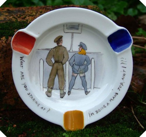 A hand painted c1940s risque ashtray. The inscription reads "What are you staring at? I'm doing a man's job ain't I???". About 10cms 3 7/8 inches in diameter and weighs 60g. This is one of a collection that we currently have in stock and are listing. Please contact us should you be interested in more than one and we will offer a reduced combined price.