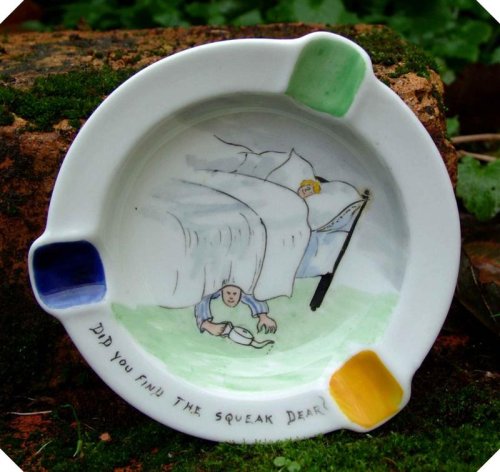 A hand painted c1940s risque ashtray. The inscription reads "Did you find the squeak dear". About 10cms 3 7/8 inches in diameter and weighs 60g. This is one of a collection that we currently have in stock and are listing. Please contact us should you be interested in more than one and we will offer a reduced combined price.